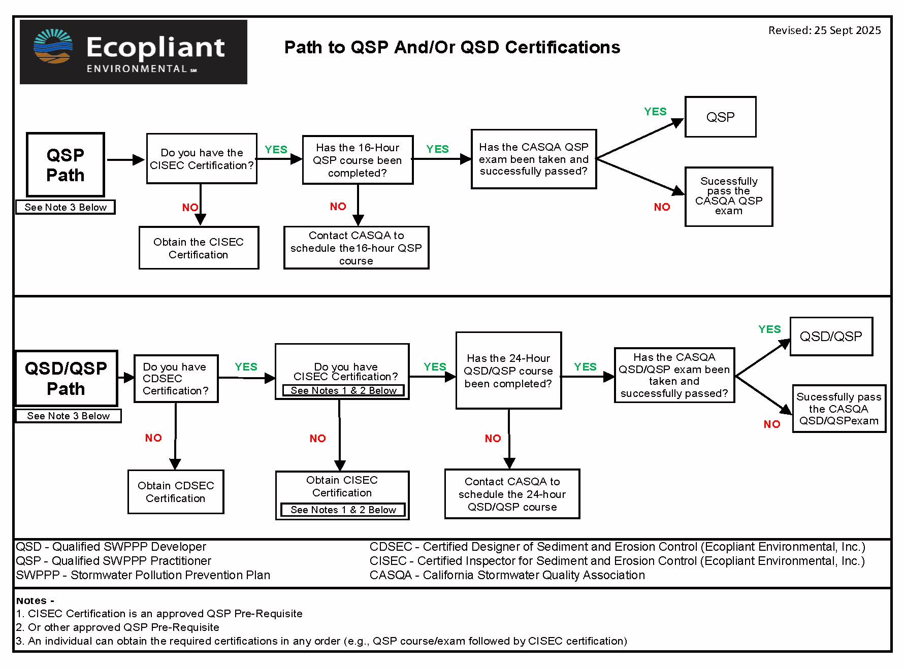 Ecopliant CDSEC was approved by the California Water Board on June 30, 2025 as an underlying certificate for the Qualified SWPPP Developer (QSD) certification. A secondary requirement has been set by the Water Board that requires anyone obtaining the CDSEC as an underlying certificate must also have “an existing Qualified SWPPP Practitioner (QSP) certification or successful completion of a QSP prerequisite.”